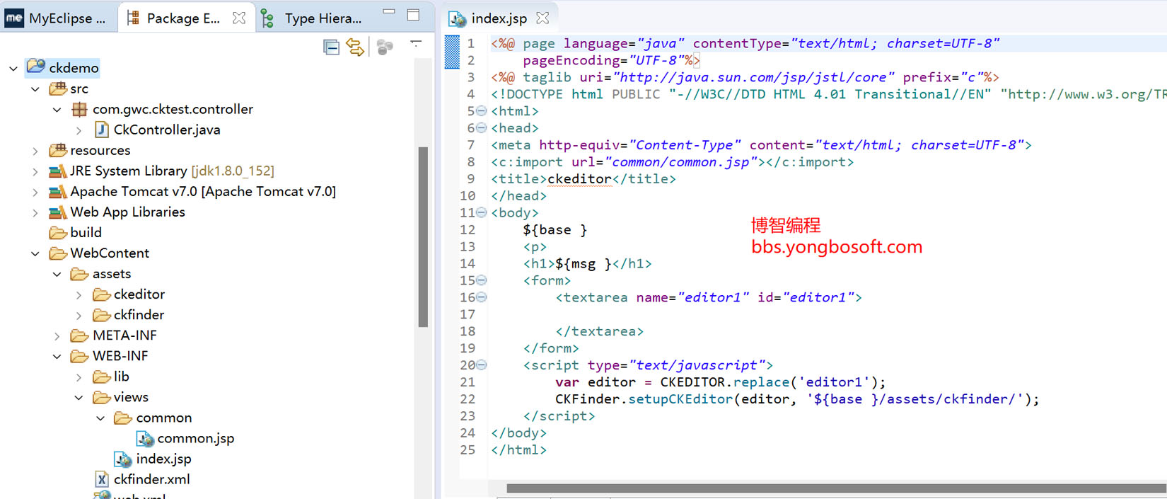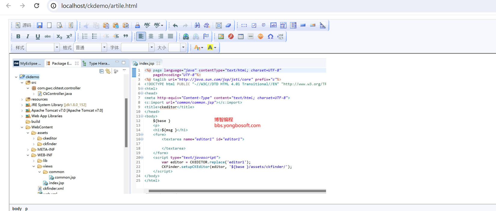 springmvc+ckeditor+ckfiner整合(含源码附件包) 1.项目介绍 本项目整合了springmvc、ckeditor和ckfiner,提供富文本编辑器功能。 2. 项目预览界面 3.项目工程目录 源码包可在附件中下载(电脑端可下载) 未经允许不得转载:学编程 » springmvc+ckeditor+ckfiner整合(含源码附件包)