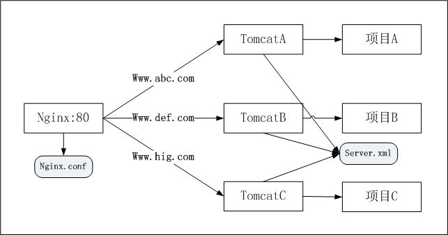 Nginx高级配置,同1台机器部署多个tomcat、配置多个域名,每个域名指向某一个tomcat下的项目,共用Nginx80端口访问;